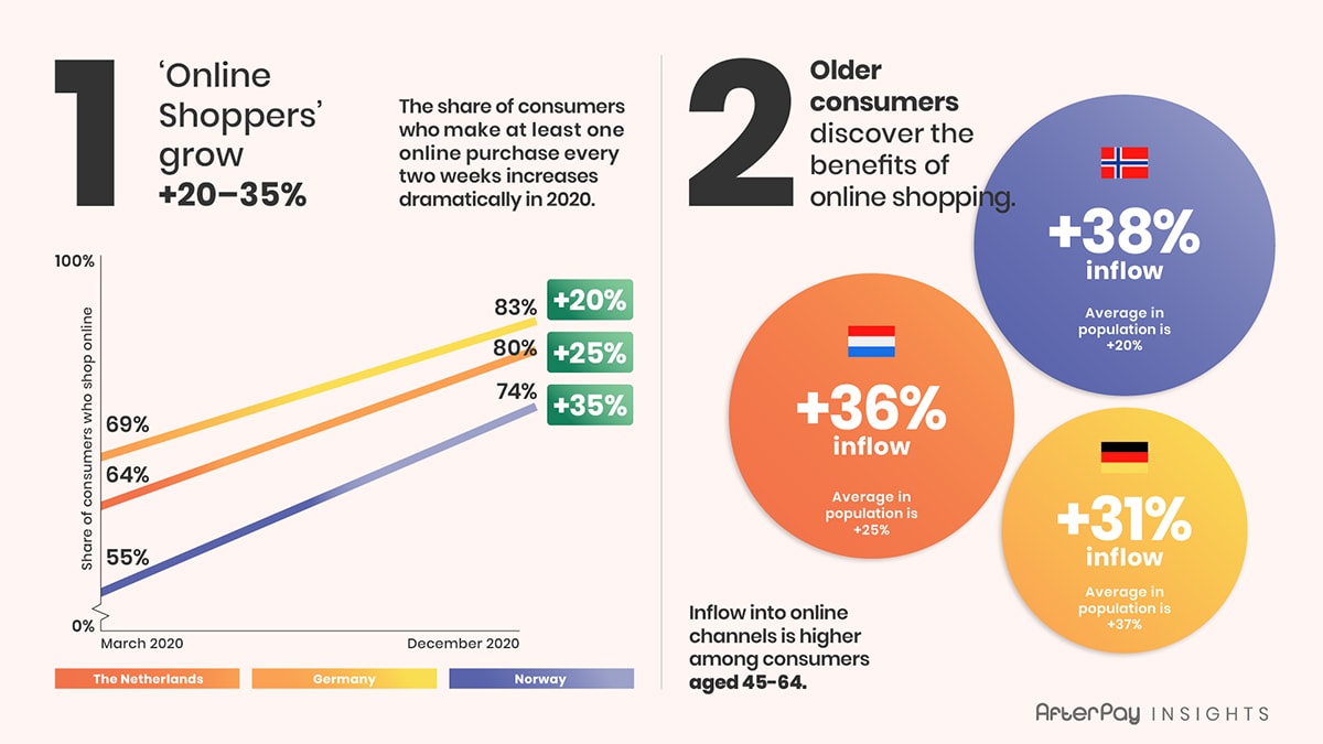 Der Zuwachs im E-Commerce bei Verbrauchern im Alter zwischen 45 und 64 Jahren ist höher als in der Gesamtbevölkerung. Das zeigt sich besonders deutlich in den Niederlanden, in denen der Anteil der Online Shopper im Jahr 2020 mit + 36 % bei den 45-64-Jährigen zunimmt, gefolgt mit + 31 % in Deutschland und + 37 % in Norwegen. Zum Vergleich: Die Zunahme neuer Verbraucher in der Gesamtbevölkerung beträgt in den Niederlanden + 25 %, in Deutschland 20 % und in Norwegen 36 %.