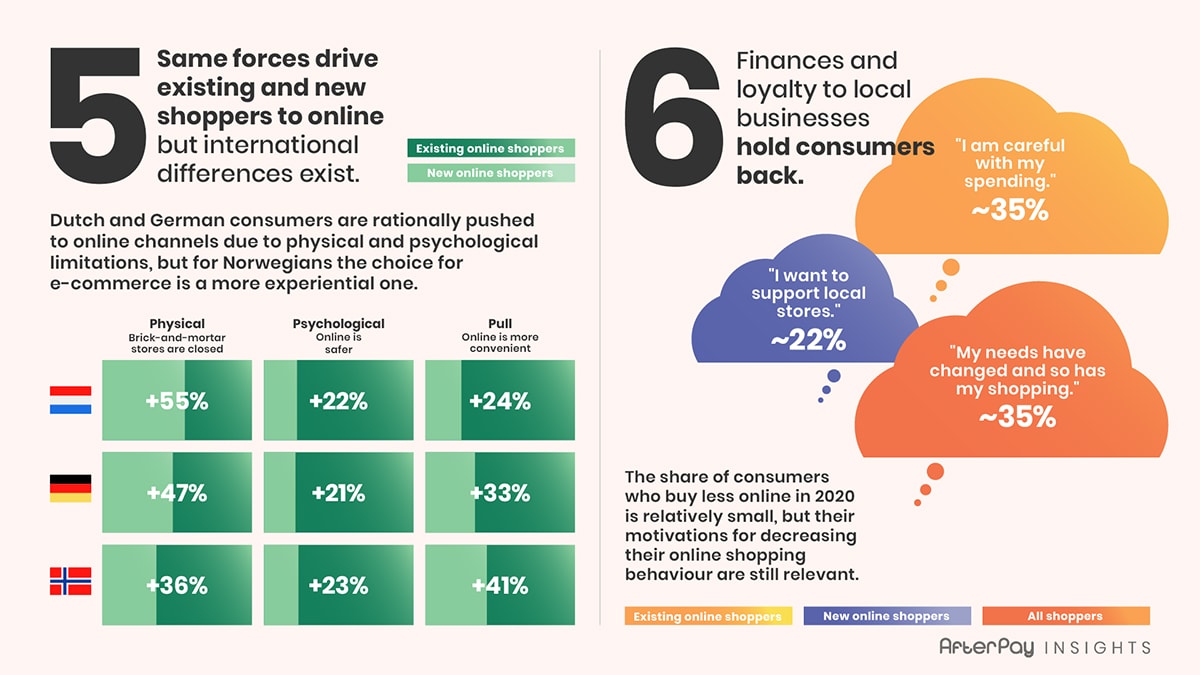 Verbraucher aus den Niederlanden und Deutschland werden zu Online-Kanälen gedrängt – durch physische („ich bin zu Hause“, „Geschäfte sind geschlossen“) und psychologische („Online-Einkäufe sind sicherer“) Beschränkungen. Für Norweger ist Online Shopping jedoch eine eher erfahrungsbasierte Wahl („online ist praktisch“, „günstiger“).