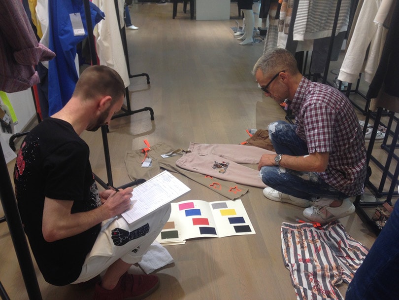 Falko Diebel: Es gibt ganz verschiedene Kunden. Die einen arbeiten nur mit Rechner nach Listen und es gibt welche, die ganz Oldschool die Kleider mitzeichnen. Unterschiedliche Handelsformen benötigen unterschiedliche Wege, ihre Kollektionen zu ordern. Department-Stores arbeiten stark mit Listenformaten während der inhabergeführte Einzelhändler eher aus dem Bauch hinaus entscheidet. Winni Klenk von Abseits in Stuttgart zum Beispiel geht durch die Kleiderständer der Kollektionen und wählt seine Favoriten aus. Er zeigt auf das, was ihm gefällt, legt die Teile, in diesem Fall Hosen, heraus und dann entscheiden wir anhand von Farbkarten, welche Styles in welchen Farben und Größen wie oft geordert werden. Das geht bei ihm ruckzuck. Aufgrund der schwierigen Marktsituation haben aktuell dennoch viele Händler die Handbremse angezogen. Auch wenn sich die Designer gerade in diese Saison alle Mühe geben, zu inspirieren.
