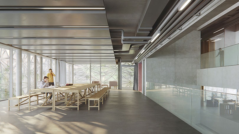 Das sogenannte Texoversum umfasst eine Fläche von 3000 Quadratmetern. In dem Gebäude sollen Werkstätten, Labore, Unterrichtsräume, eine Textilsammlung und Think-Tank-Flächen (Anm. d. Red.: akustisch entkoppelte Rückzugsflächen) untergebracht werden.