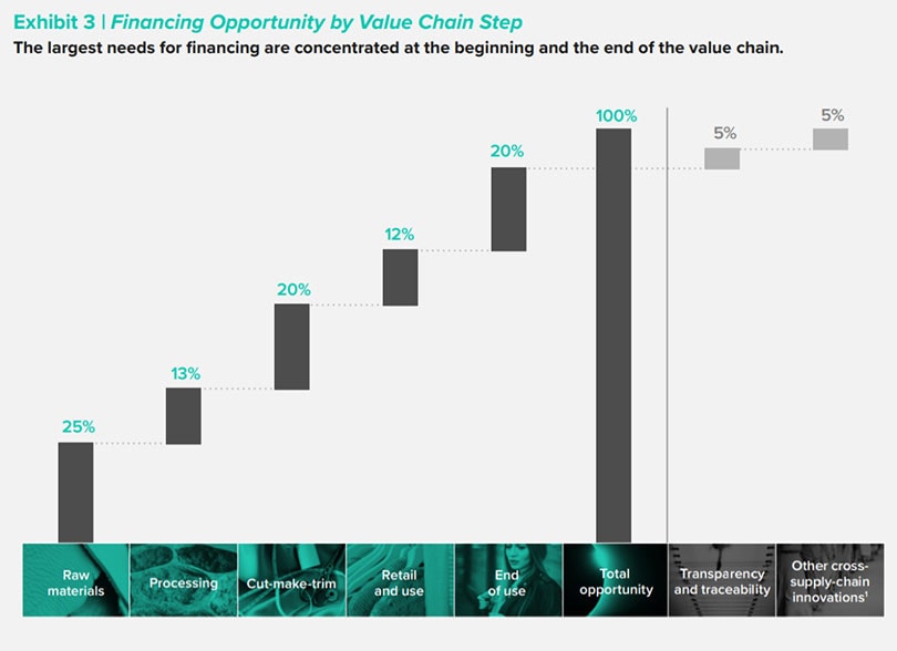 Eines der wichtigsten Ergebnisse des Berichts ist, dass bis jetzt nur ein Bruchteil des gesamten verfügbaren Kapitals in Bekleidungs- und Textiltechnologie investiert wurde, so dass viele Innovatoren in einer Finanzierungslücke stecken bleiben, die ihre Fähigkeit zur Entwicklung und Skalierung ihrer Innovationen behindert. Darüber hinaus liegt fast die Hälfte der jährlichen Finanzierungsmöglichkeiten von 20 bis 30 Milliarden US-Dollar am Anfang und am Ende der Wertschöpfungskette, wo Rohstoffe und Anwendungslösungen das höchste Wirkungspotenzial haben. Innovatoren haben jedoch Schwierigkeiten, diese „fehlende Mitte“ der Finanzierung zu überbrücken.