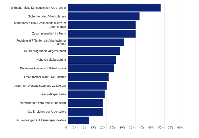 Konkret sorgen sich die Befragten um ihnen nahestehende Personen, etwa ältere oder kranke Menschen (68 Prozent), aber auch um die Wirtschaftssituation in Deutschland (63 Prozent) und eigene mögliche finanzielle Schwierigkeiten (41 Prozent). Nur wenige sorgen sich dagegen um private Ereignisse wie Hochzeits- oder Geburtstagsfeiern (19 Prozent), öffentliche Großveranstaltungen wie Festivals (13 Prozent) und nur 18 Prozent haben Angst vor der sozialen Isolation, so eine StepStone-Umfrage zur Arbeitssituation in der Corona-Krise vom März 2020.