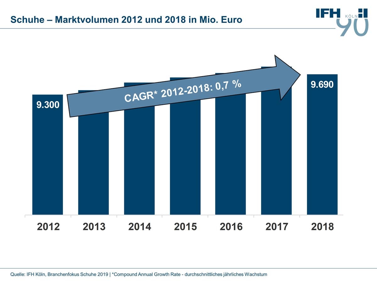 Nach Jahren des geringen, aber kontinuierlichen Wachstums im Schuhmarkt verzeichnet die Branche 2018 erstmals rückläufige Zahlen. Seit 2012, wo das Marktvolumen noch auf 9,3 Milliarden Euro beziffert wurde, liegt die durchschnittliche jährliche Wachstumsrate des deutschen Schuhmarktes bei 0,7 Prozent. 2018 wurde ein Marktvolumen von insgesamt 9,7 Milliarden Euro erreicht was einen leichten Rückgang bedeutet.
