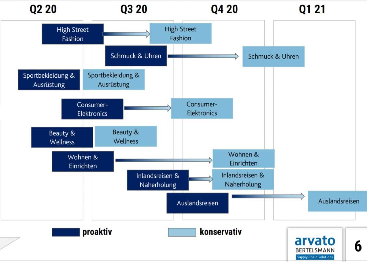 Was die Dauer der Erholung angeht - die Frage, die die Branche am meisten interessiert - so kommt dies auf die Warengruppe und auf das zu erwartende Szenario an, ob es konservativ ist mit anhaltenden Kontaktverboten und Ausgangssperren oder proaktiv mit Kontaktverboten und Ausgangssperren, die ab Mai dauerhaft aufgehoben werden und die Wirtschaft so sukzessive hochfahren.