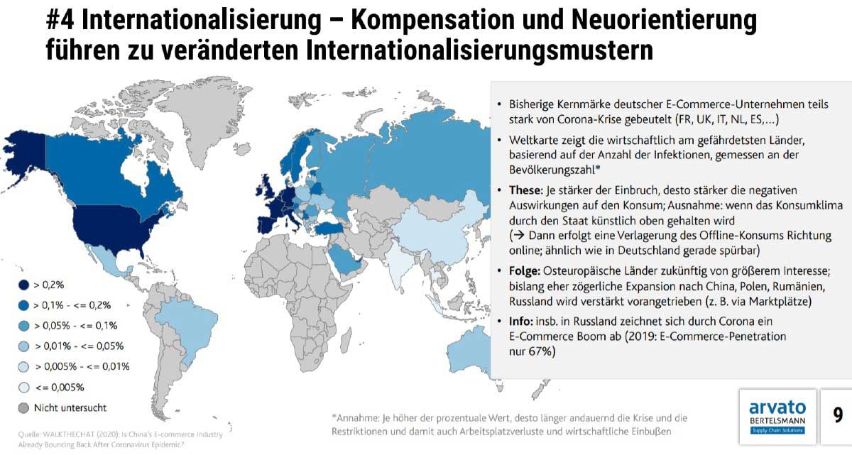 Die Konkurrenz aus dem Ausland schläft jedoch nicht - dies gilt sowohl für neue Marktplatz-Betreiber und -Händler als auch Geschäftsmodelle. Interessant wird zu beobachten sein, wie Kernmärkte sich international verschieben. Für deutsche E-Commerce-Unternehmen interessante Märkte wie Frankreich, Großbritannien, Italien, die Niederlande und Spanien etwa sind stark von der Corona-Krise beeinträchtigt, während wirtschaftlich weniger gefährdete Länder wie Osteuropa, Russland, China und Indien, die zuvor von sekundärem oder tertiärem Interesse waren, an Bedeutung gewinnen werden.