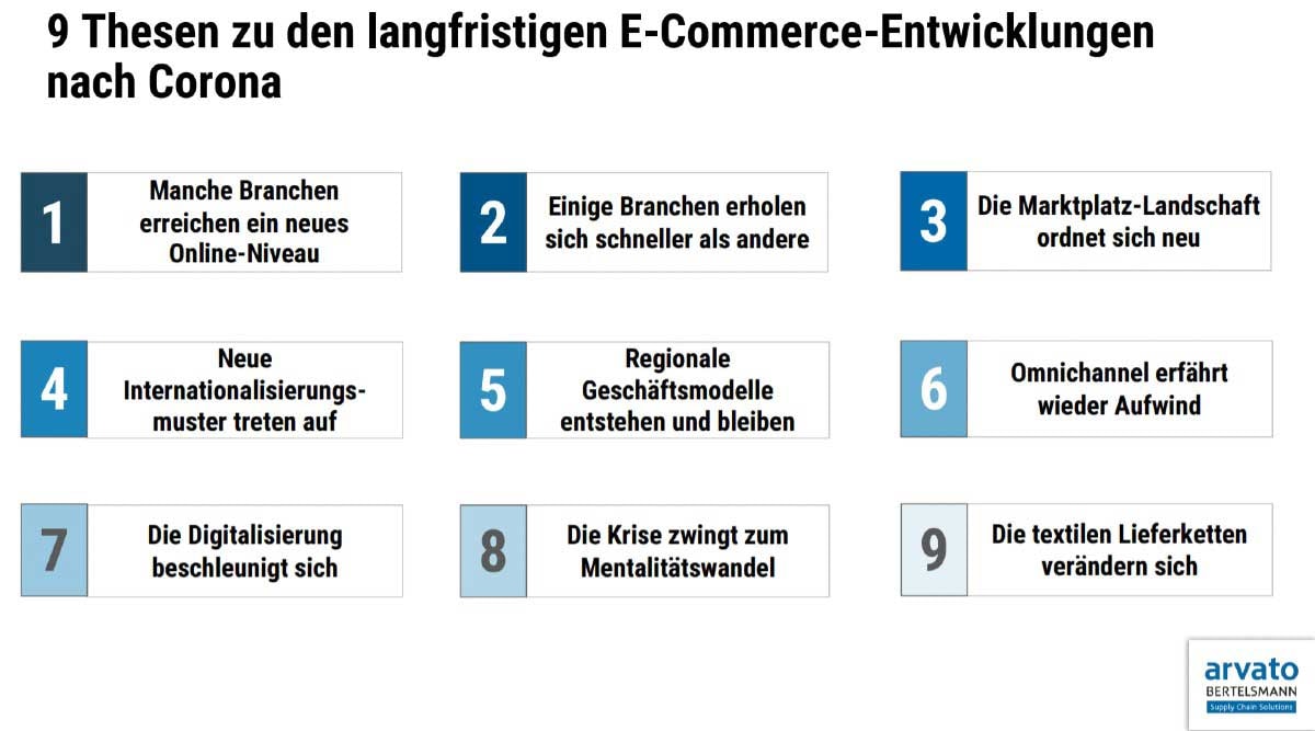 Analysiert wurden unter anderem wie sich einzelne Marktsegmente und Warengruppen - darunter auch Mode, Accessoires und Sportbekleidung - entwickeln, welche Chancen die in der Corona-Krise neu entstandenen regionalen Geschäftsmodelle haben, wie sich die Marktplatzlandschaft neu ordnen wird und welche Veränderungen bei den weltweiten textilen Lieferketten erwartet werden und in neun Thesen dargestellt.
