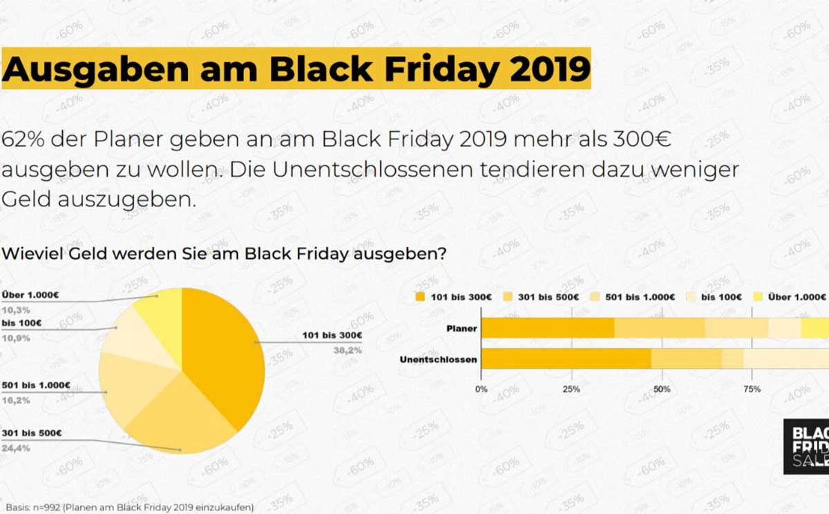Am 28. November ab 19 Uhr ist es wieder soweit: Dann startet der „Black Friday“, ein weltweiter Schnäppchentag, an dem Einzelhändler ihre Ware oft drastisch reduzieren. Anders als etwa der Winter- und Sommerschlussverkauf ist der Black Friday auf wenige Stunden begrenzt - 111 um genau zu sein - und endet also am 2. Dezember. Über 82 Prozent der deutschen Endverbraucher sind bereits mit dabei - 62 Prozent planen sogar, 300 Euro oder mehr auszugeben. Dies fand eine repräsentative Stichprobe von 1.002 deutschen Endverbrauchern der Wiener Black Friday GmbH heraus, dem ältesten Black Friday-Portal Deutschlands, das seit 2012 dabei ist und für dieses Jahr einen Umsatz im deutschen Einzelhandel von 3 Milliarden Euro vorhersagt; im letzten Jahr wurden 2,4 Milliarden Euro umgesetzt.