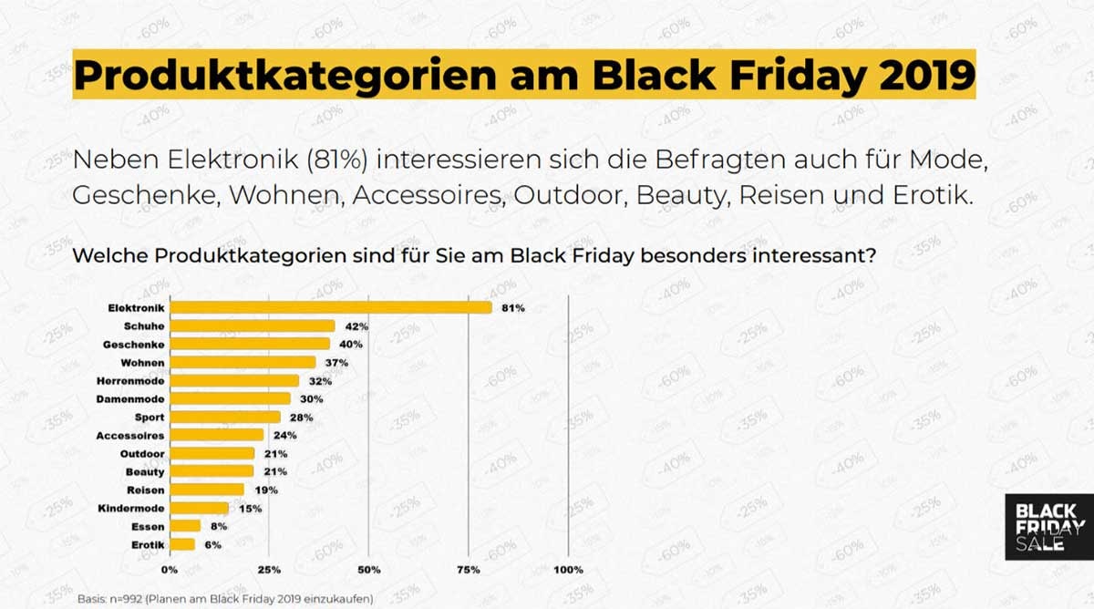 Fast 80 Prozent der Befragten planen am Black Friday etwas für sich selbst zu kaufen und rund 50 Prozent sehen den Schnäppchentag als gute Gelegenheit, bereits im November ihre Weihnachtsgeschenke zu besorgen. Während der Freitag erfahrungsgemäß der umsatzstärkste Tag sein wird, warten 36 Prozent der Befragten jedoch bis zum Cyber Monday, dem Montag danach. 69 Prozent der Befragten sind der Meinung, dass der Black Friday für den deutschen Onlinehandel eine gute Gelegenheit biete, sich gegenüber ausländischen Internet-Konzernen zu profilieren.