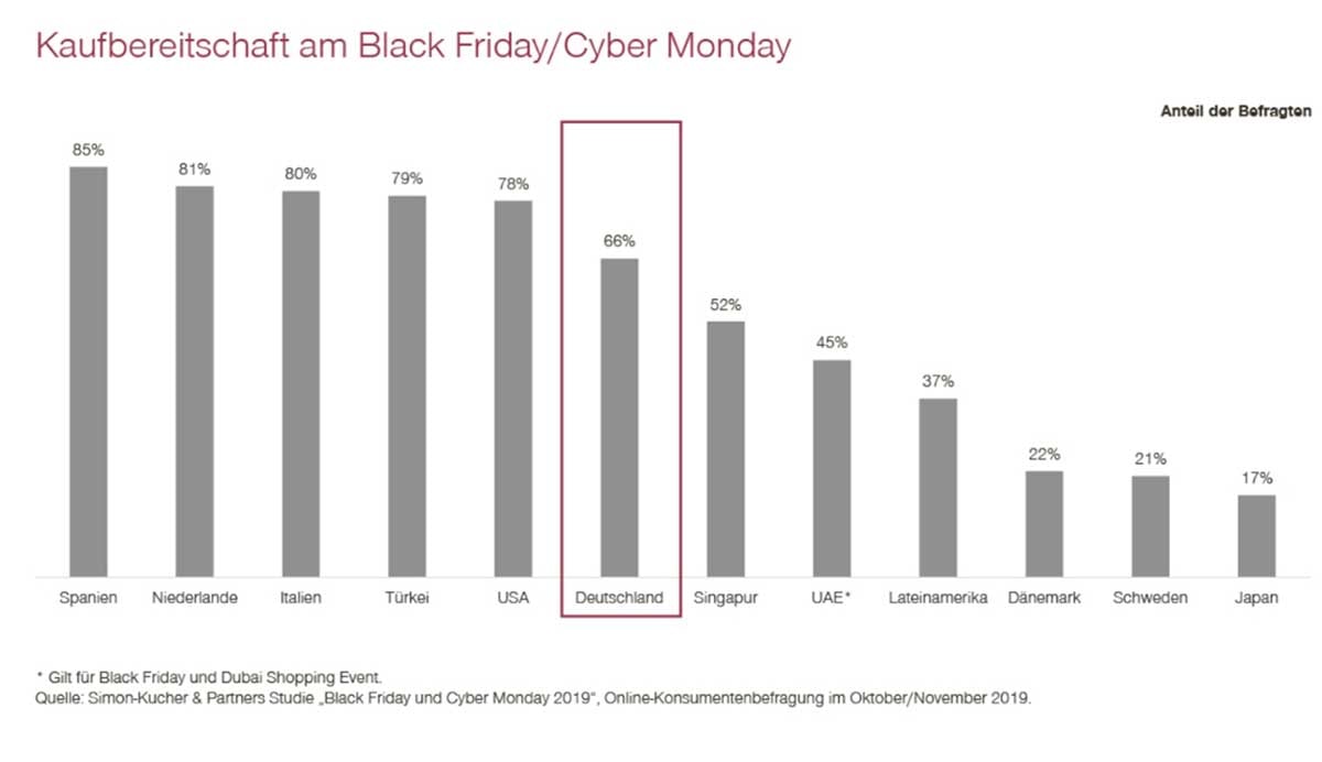 Die Studie „Black Friday und Cyber Monday 2019“ befragte im Oktober und November 2019 online knapp 12.000 Konsumenten in 14 Ländern (Argentinien, Chile, Dänemark, Deutschland, Italien, Japan, Schweden, Singapur, Spanien, Türkei, Mexiko, Niederlande, UAE, USA) zu ihrem Konsumverhalten an diesen beiden Tagen. Während der Black Friday in Deutschland, den USA, Italien, Spanien, Dänemark und Schweden generationsübergreifend sehr bekannt ist (nahezu 100 Prozent), gaben in Japan geben lediglich 54 Prozent der Befragten an, den Black Friday zu kennen. Der Cyber Monday ist vor allem in den USA (95 Prozent) und in Deutschland (83 Prozent) sehr bekannt.