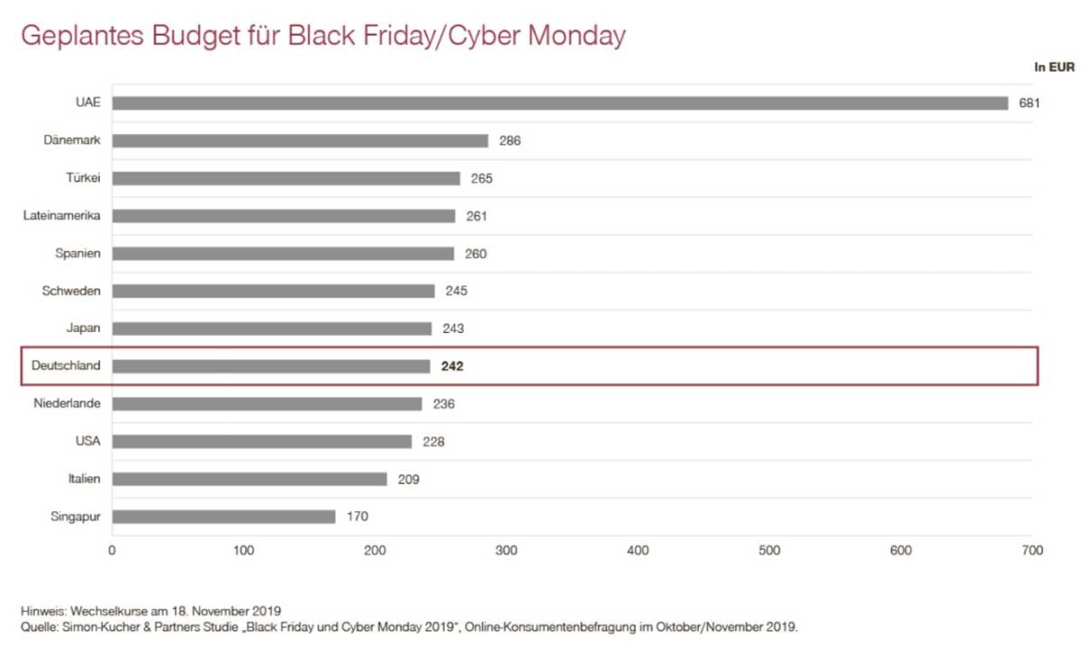 Auch was das Budget angeht, ergeben sich Unterschiede im Ländervergleich: Spitzenreiter sind die Vereinigten Arabischen Emirate (UAE) mit einem geplanten Kaufbudget von 681 Euro. „Hier sind die Preise allerdings grundsätzlich höher als in europäischen Ländern“, merkt die Studie an. Spitzenreiter in Europa ist Dänemark. Deutschland und die USA liegen mit durchschnittlich jeweils 242 Euro und 228 Euro im Mittelfeld, während Verbraucher in Italien die Rabatt-Tage mit 209 Euro vorsichtiger angehen. Das Schlusslicht bildet Singapur mit umgerechnet rund 170 Euro.