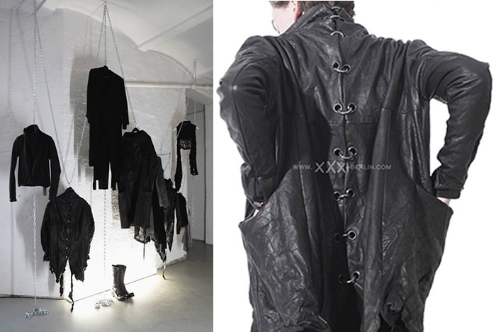 Der gesamte Store, der sich in einem Loft befindet, erinnert an irgendetwas zwischen SM-Studio, Metzgerei und Highfashion-Showroom. Teilweise sind die Wände weiß gefliest und mit dicken silbernen Ketten behangen. Auch von der Decke hängen Ketten, Seile und diverse Gestelle mit Fleischerhaken, auf einem Regal liegt eine nackte Schaufensterpuppe, die Sitzflächen des Sofas und eines Sessels sind mit dem bereits bekannten schwarzen Klebeband beklebt, was dem Ganzen einen sterilen ‘50-Shades-of-Grey-Touch’ verleiht. Die Kleidungsstücke, die an den Kleiderstangen im Industrial-Look hängen, sind allesamt schwarz. Man kann kaum erkennen wo das eine Teil aufhört und wo das nächste anfängt. Die Teile sind alle sehr extravagant, vom ‘Freddy Krueger-’ bis zum ‘Edward mit den Scherenhänden-Look’ ist wirklich alles dabei, was man mit Schwarz anstellen kann. Dabei bleibt die Mode jedoch anspruchsvoll, kreativ und detailverliebt.