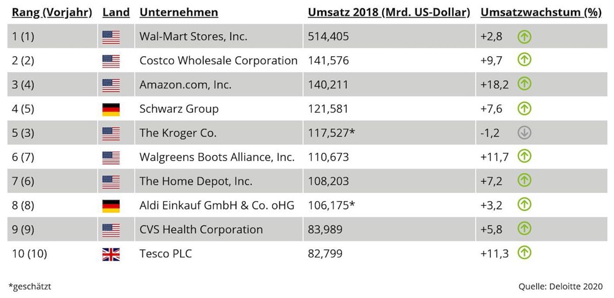 Die Spitzenposition in der weltweiten Umsatzrangliste behauptete der US-Konzern Wal-Mart Stores, der 2018 auf einen Jahresumsatz von 514,4 Milliarden US-Dollar kam (+2,8 Prozent). Den zweiten Platz belegte erneut die Großhandelskette Costco (141,6 Milliarden US-Dollar, +9,7 Prozent). Neu im Spitzentrio ist hingegen der Online-Händler Amazon. Mit einem Umsatzplus von 18,2 Prozent auf 140,2 Milliarden US-Dollar schob er sich vom vierten auf den dritten Rang vor.