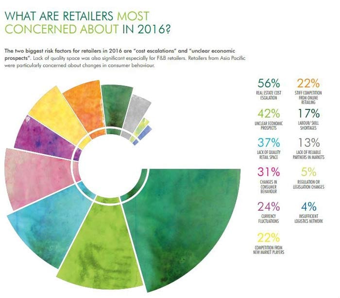 Wie auch im Vorjahr ist ein solides Netzwerk stationärer Geschäfte immer noch unverzichtbar für Einzelhändler, denn so können sie aktuelle Herausforderungen wie Kostensteigerung, Konkurrenz durch E-Commerce und Veränderungen im Verbraucherverhalten meistern. 83 Prozent der befragten Einzelhändler gab an, die Expansion ihres stationären Einzelhandelsnetzwerk werde vom Online-Wachstum 2016 nicht beeinflusst, und nur 22 Prozent machten sich über Internethändler als Konkurrenz Gedanken.