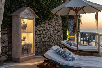 Auf Capri gibt es bereits eine Dior-Boutique in der Via Camerelle, der Pop-up Store hingegen befindet sich im Il Riccio Restaurant & Beach Club, einem Teil des 5-Sterne Hotels Capri Palace Jumeirah. Der Store ist dank eines speziellen Bootsservices auf dem Seeweg erreichbar. Passend zur umgebenden Natur bestimmen eine üppige Bepflanzung und das Dekor aus Bambus das Interior des Geschäfts. Blau getönte Toile de Jouy-Motive bedecken die Wände in einer zeitgenössischen Interpretation traditioneller italienischer Keramik.