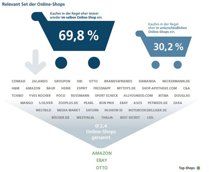 Mehr als zwei Drittel der Online-Shopper kauft vorrangig immer wieder bei denselben Anbietern – durchschnittlich bei 2,4 Shops. Lediglich rund 30 Prozent der Befragten kaufen regelmäßig bei wechselnden Online-Shops. Dabei wurden als wichtigste Mode-Shops im deutschen Raum Amazon, Ebay, Otto, Zalando, Brands4Friends, Dawanda, Neckermann, H&M, Baur, Heine, Esprit, C&A, Tchibo, Sport Scheck, Mango, S.Oliver, Bon Prix, Asos, Zara und FashionID genannt.