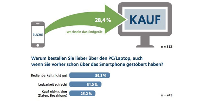 28,4 Prozent der Online-Shopper wechseln vor dem Kaufabschluss das Endgerät. Den jüngeren Konsumenten sind die Mobile-Shops zu umständlich bei der Dateneingabe oder zu kompliziert zu bedienen, für ältere Shopper sind die schlechte Lesbarkeit und die Angst vor Sicherheitsmängeln Hauptründe zum Wechseln. Trotzdem kauft bereits ein Viertel der Online-Shopper auch über das mobile Endgerät. Auch in diesem Bereich liegen die Frauen vorne: 23,6 Prozent von ihnen nutzen mobile Endgeräte häufiger zur Informationssuche in Suchmaschinen als Männer (14,5 Prozent). Auch den Kauf schließen sie häufiger über mobile Endgeräte online ab. Im Vergleich: 16,1 Prozent der Frauen stehen gerade einmal 9,4 Prozent der Männer beim mobilen Kaufabschluss gegenüber.