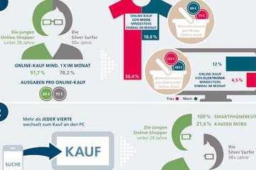 Jung und alt sind mittlerweile im Internet und in E-Commerce angekommen. Die Silver Surfer der ‚internetrepräsentativen' Studien nutzen das Internet zu über 78,2 Prozent mehrmals täglich, bei den unter 29-Jährigen tun dies sogar 91,7 Prozent. Die über 50-Jährigen geben dabei rund 10 Euro mehr pro Online-Einkauf aus. Bei den unter 29-Jährigen besitzen nahezu 100 Prozent ein Smartphone, bei den über 50-Jährigen sind es immerhin 60 Prozent. „Grundsätzlich lassen sich Online-Shopper aber nicht mehr pauschal in ‚die Jungen‘ und ‚die Alten‘ aufteilen. Auch der Großteil der Silver Surfer ist mittlerweile mehrmals täglich online und kauft im Netz bei seinen Lieblingsshops. Unterschiede zwischen den Zielgruppen im Online-Shopping-Verhalten lassen sich erst bei genauerem Hinsehen erkennen, zum Beispiel in puncto Mobile Shopping oder in Bezug auf Warengruppen“, erklärt Dr. Kai Hudetz, Geschäftsführer des IFH Köln.