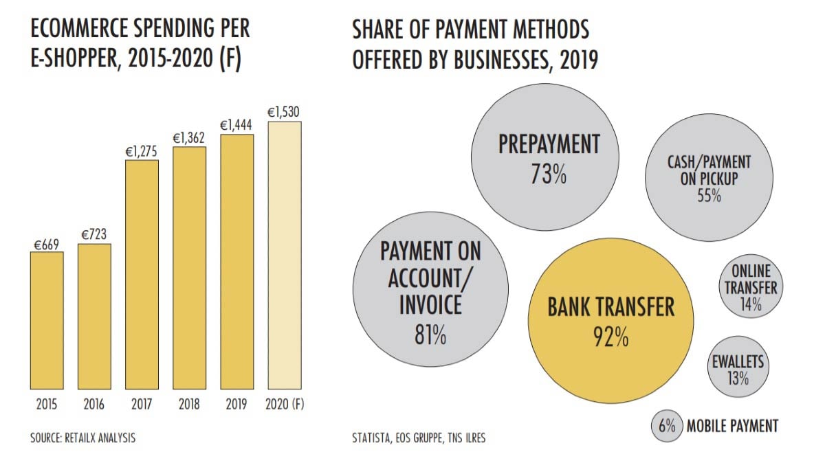Die Ausgaben haben sich dabei laut RetailX im Jahresvergleich mehr als verdoppelt: von 669 Euro pro Online-Shopper im Jahr 2015 auf 1.444 Euro im Jahr 2019. Bei den von Onlinehändlern angebotenen Zahlungsmethoden liegen Überweisungen mit 92 Prozent weit vorn, gefolgt von der Zahlung auf Rechnung (81 Prozent), Vorauszahlung (73 Prozent), Bargeld oder andere Zahlung bei Abholung (55 Prozent), Online-Überweisung (14 Prozent), E-Wallets (13 Prozent) oder Zahlung über das Smartphone (6 Prozent; laut einer Zusammenstellung von Statista, der EOS Gruppe und TNS Ilres).