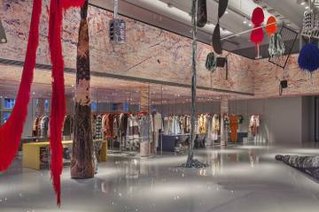 Das historische Gebäude wurde vom Künstler Sterling Ruby gestaltet, der seit längerem mit Simons zusammenarbeitet. In Kooperation mit dem Architecture Research Office hat Ruby das Gebäude in einen offenen Raum umgestaltet, das von der Decke bis zum Fußboden reicht. Der Künstler nutzt auf der 1.400 Quadratmeter großen Fläche Motive, die er bereits zuvor für die Läden und Showrooms der Marke in den USA etabliert hat.