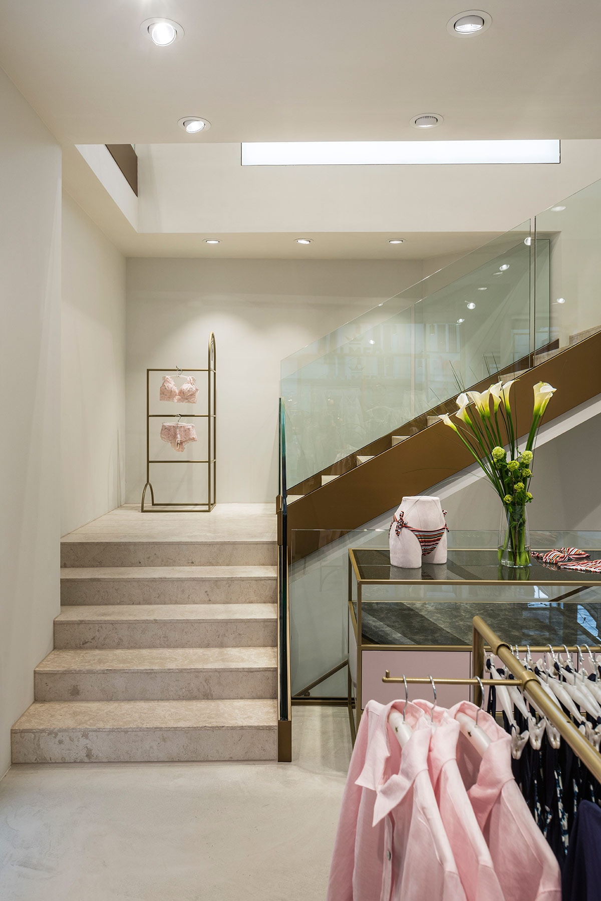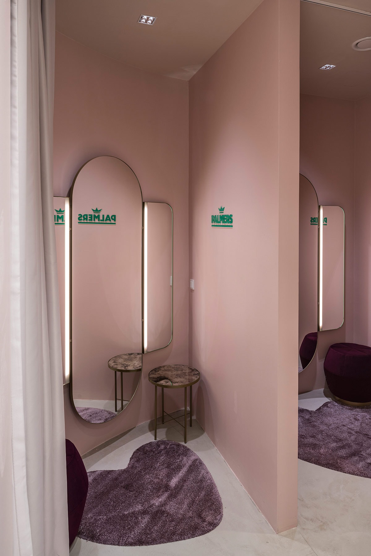 Mit einer Einrichtung in den Farben Creme, Eichenholz, Rosa und Gold präsentiert sich der kernsanierte Store nicht nur mit neuem Design. Der Laden bietet im Obergeschoss auch erstmals die Heimtextilien und Wohnaccessoires im Palmers Homestore an.