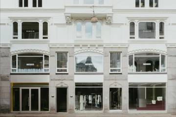 Der von dem Architekten Thibaut Allgayer gestaltete Store befindet sich in einem Gebäude in der Kristen Bernikows Gade 6, das auch das Hauptbüro des Birger-Christensen-Kollektivs beherbergt. Im Inneren werden verschiedene architektonische Techniken eingesetzt, darunter freistehende Wände, Raumteiler und maßgefertigte Möbel, um einen flexiblen Raum zu schaffen. Besucher:innen werden durch einen drehbaren Tresen und ein burgunderrotes lackiertes Korridor geleitet, der zu kaleidoskopischen Spiegeln in den Umkleidekabinen führt. Der hintere Teil des Ladens bietet einen intimen, ovalen Raum mit vintage Möbeln und silbernen Vorhängen.