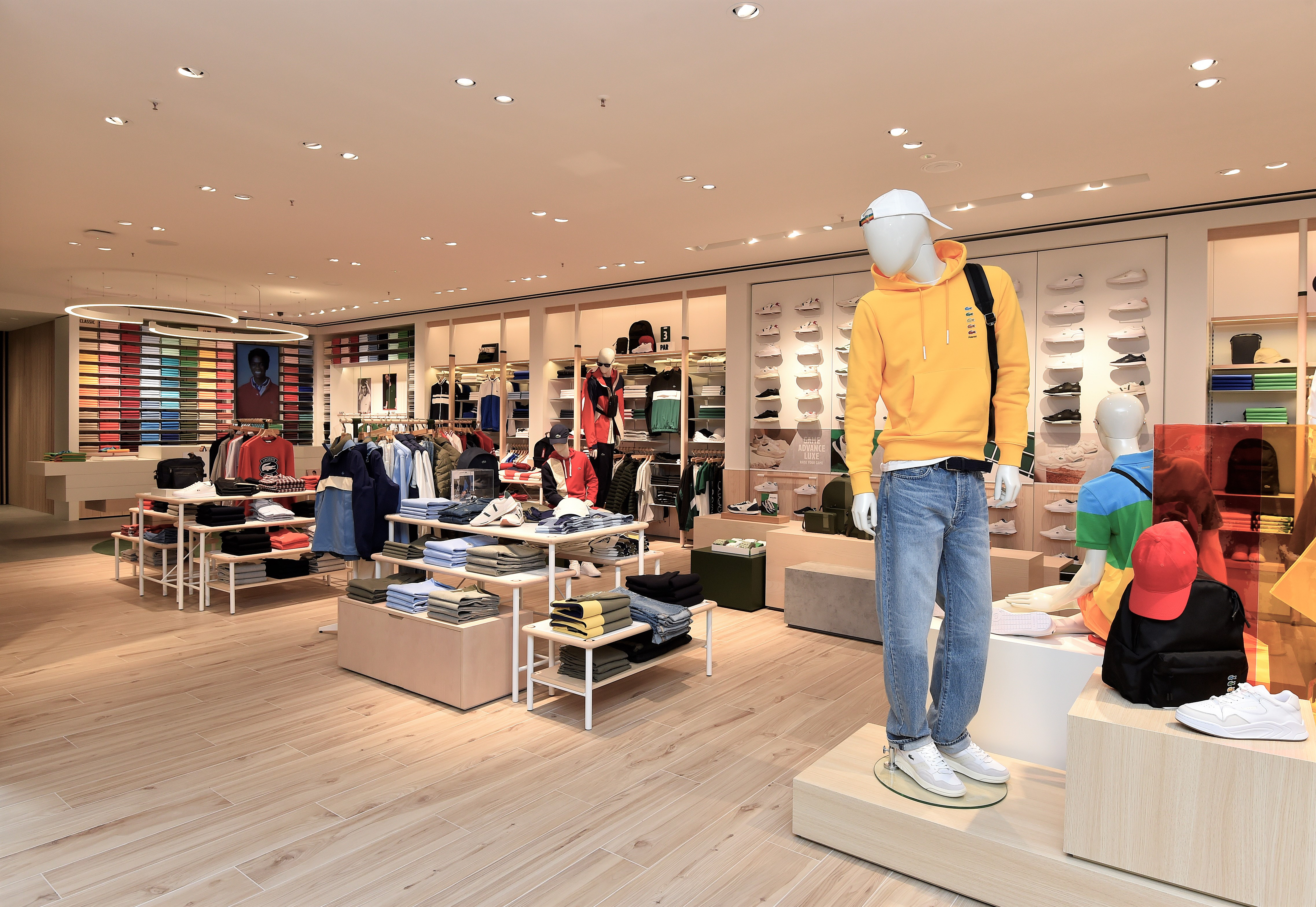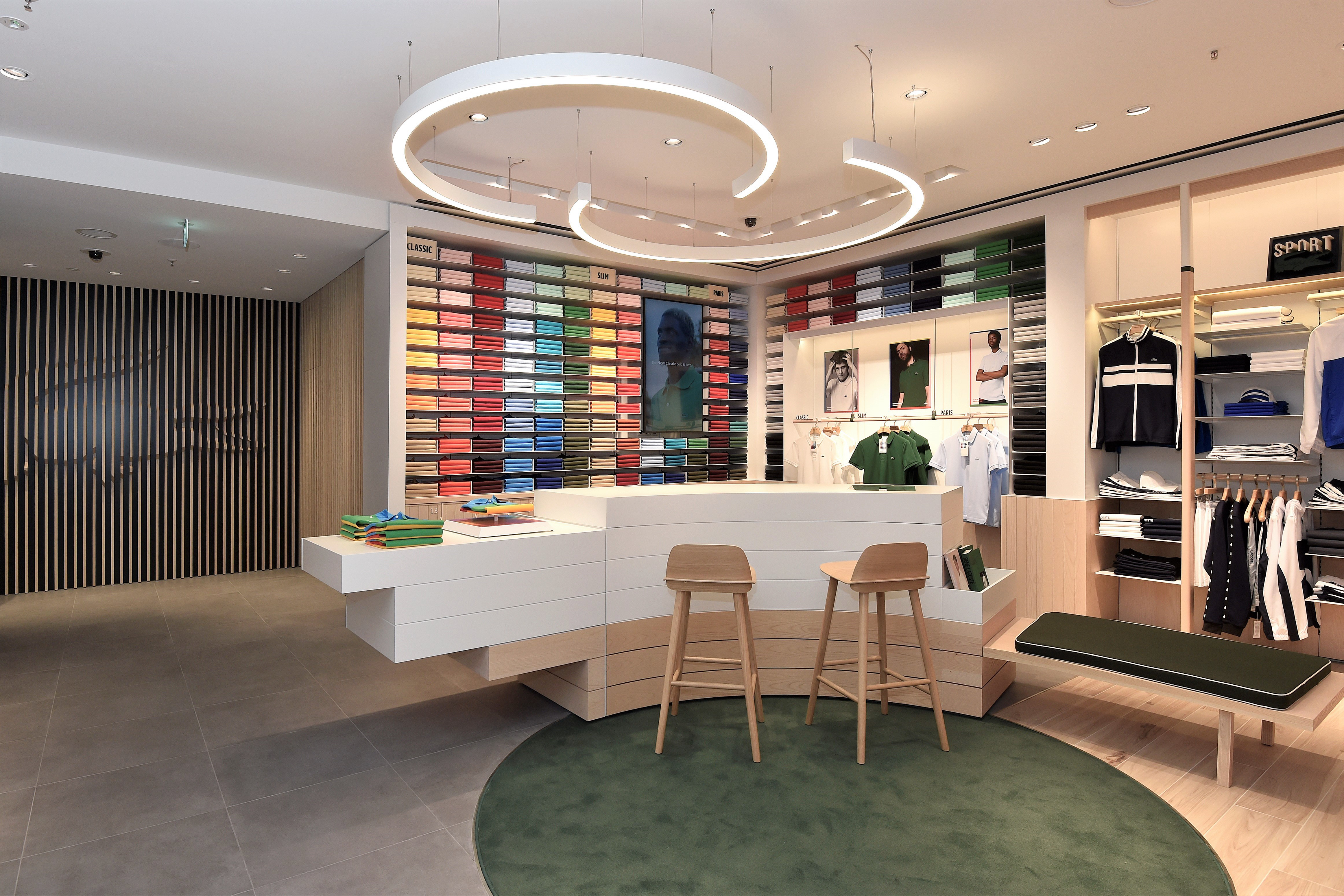 Der Store wurde im „Le Club”-Konzept gestaltet und soll neben der Markenidentität auch die Premiumisierung der Retail-Fläche fortführen, heißt es in der Mitteilung. Den Mittelpunkt bildet die Polo-Wall, die dem Lacoste-Poloshirt gewidmet ist. Neben sportlicher Eleganz wird auch die Streetwear der Marke angeboten sowie Schuhe, Taschen Accessoires und Unterwäsche. Die einzelnen Segmente sind in Nischen unterteilt, die an Umkleiden in Tennis- und Golfclubs erinnern sollen.