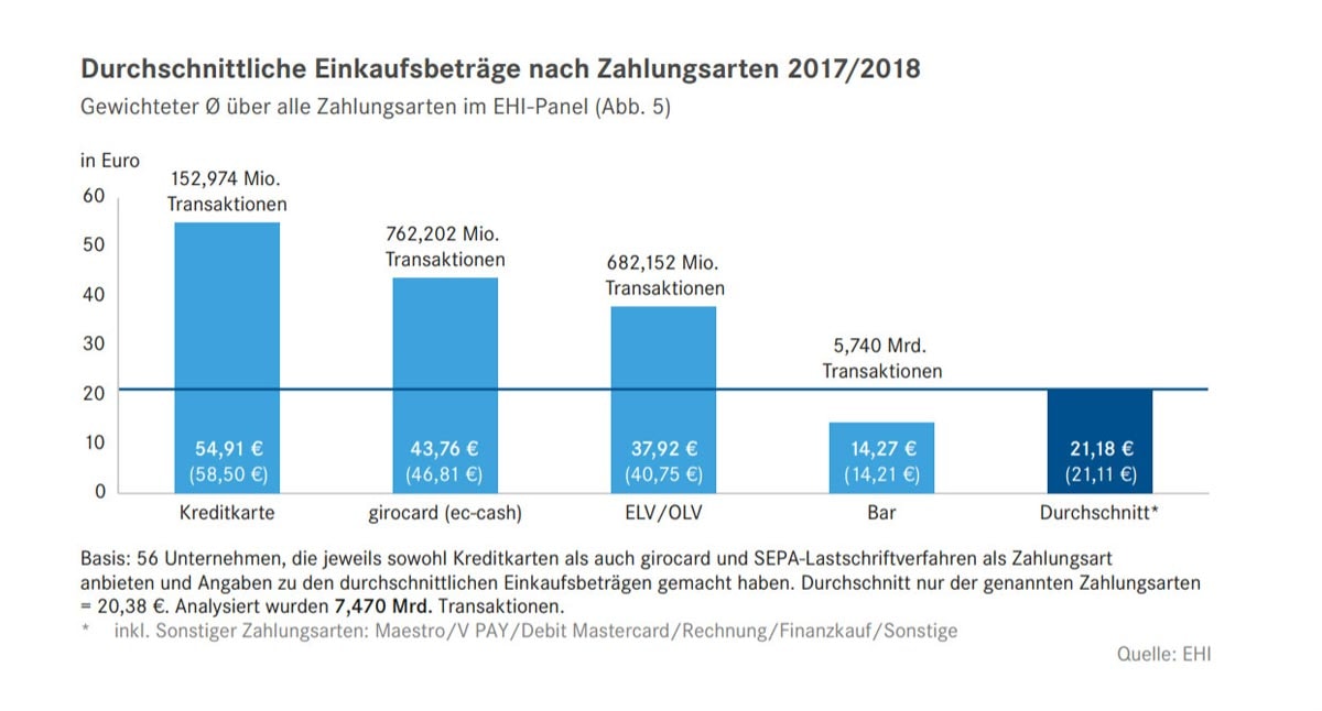 Betrachtet man jedoch die Anzahl der Transaktionen - 20 Milliarden in Deutschland im Jahr 2018 - so liegt Bargeld weiterhin vorn, mit 15,2 Milliarden Transaktionen in bar und 4,6 Milliarden mit Karte (0,2 entfallen auf sonstige). Zudem werden immer noch 76,1 Prozent aller Einkäufe im Einzelhandel mit Bargeld beglichen; der Bargeldanteil fiel jedoch im Vergleich zum Vorjahr um 1,1 Prozentpunkte, was 220 Millionen Transaktionen entspricht.