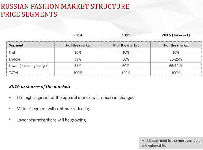 Internationale Modemarken wie Zara, Mango und Gap, die sich an Mittelklassekunden richten, müssen sich auf die neuen Verhältnisse einrichten, da sie jetzt vom durchschnittlichen russischen Mittelklasseverbraucher als "zu teuer" eingestuft werden. Selbst finanziell besser gestellte Kunden wie Ärzte, Lehrer und Manager, die auf ihren Einkauf in modernen Einkaufszentren nicht verzichten möchten, werden verstärkt nach Schnäppchen, Ausverkäufen und Rabatten Ausschau halten, während der Rest sich vielleicht mit dem Schaufensterbummel begnügt.