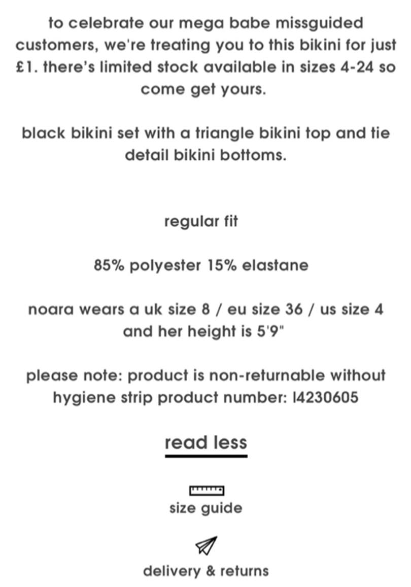 Der Telegraph schrieb: „Missguideds 1-Pfund-Bikini ist sehr problematisch, es ist für die Regierung an der Zeit, etwas in Bezug auf Fast Fashion zu unternehmen.“