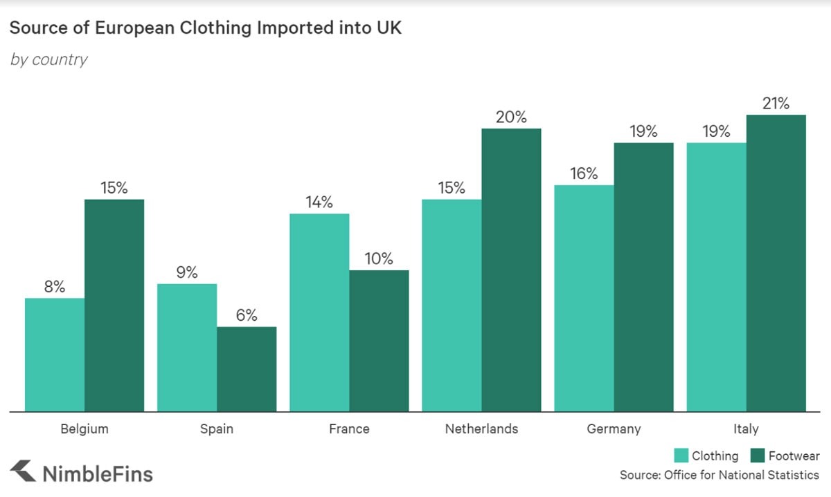 Derzeit stammen rund ein Drittel der britischen Bekleidungsimporte und mehr als die Hälfte der importierten Schuhe aus der EU, wobei die meisten aus Italien, Deutschland und den Niederlanden stammen.