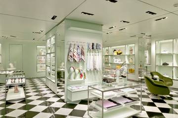 Sie alle wurden so umgestaltet, dass sie ihrem Vorbild, dem Prada Store in der Galleria Vittorio Emanuele III in Mailand nacheifern. Dazu gehört der Einbau des stilprägende Marmorfußbodens im schwarz-weißen Schachbrettmuster und Wände, Regale und Tische im ikonischen pastellgrünen Farbton der Marke. Zudem feiern grüne Wände und Samtsessel das Design der italienischen 50er Jahre.
