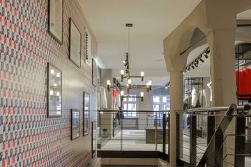Das Konzept des Geschäfts ist im Inneren an die DNA der französischen Marke angelehnt und unterstreicht deren Verbundenheit mit den Bergen. Die Herkunft der Marke schlägt sich in architektonischen Elementen und in der Verwendung traditioneller Materialien nieder, wie beispielsweise verwitterter Lärche, Schieferstein und schwarzem Eisen, die ursprünglich am Firmensitz in Saint Jean de Moirans verwendet wurden. Die Treppe ziert ein Allover-Print des dreifarbigen Hahns aus, dem Logo von Rossignol.
