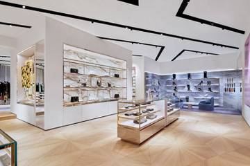 Das Interieur des Stores, das nach dem Konzept des berühmten Architekten Gwenael Nicolas entworfen wurde, besteht aus weißem Venus-Marmor, Eukalyptus Eukalyptusholzböden und goldenen und blauen Plüsch-Teppichen.