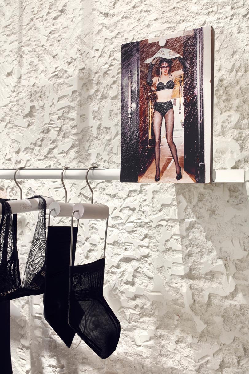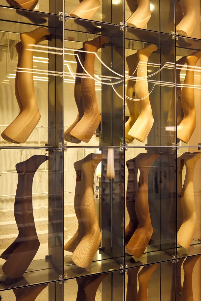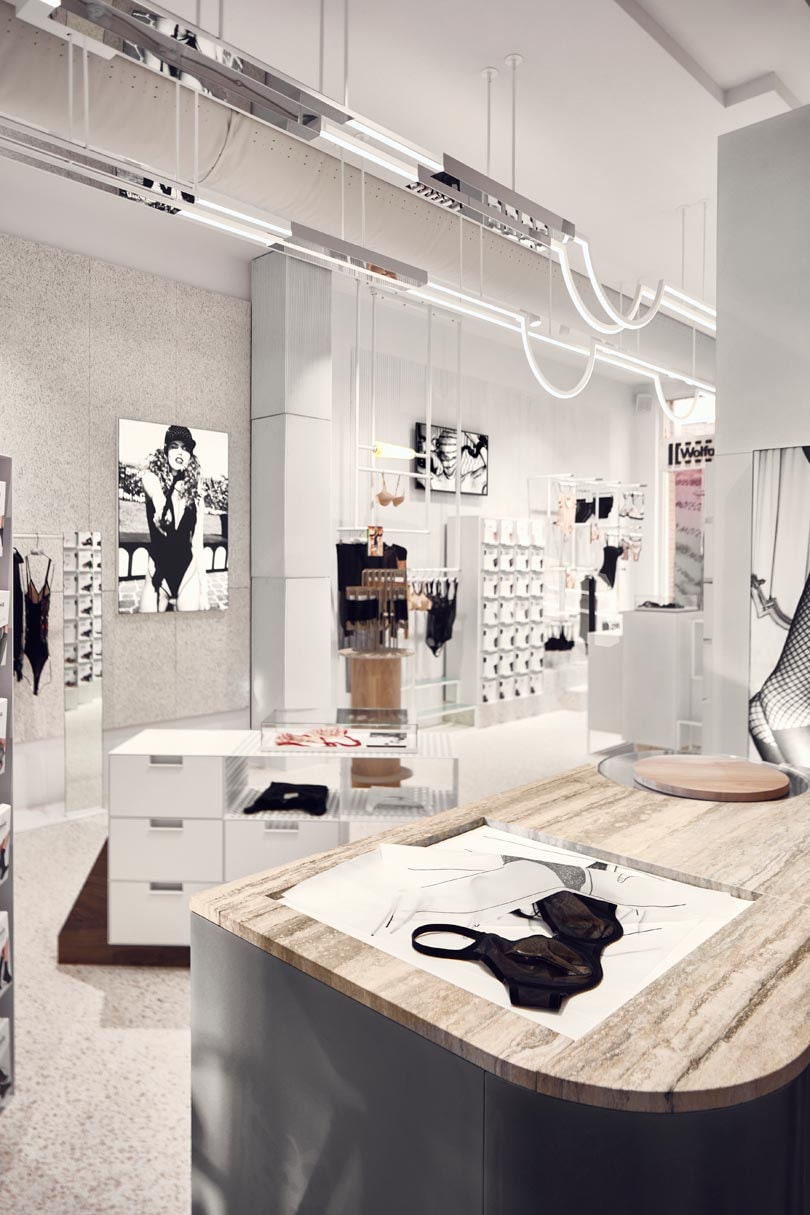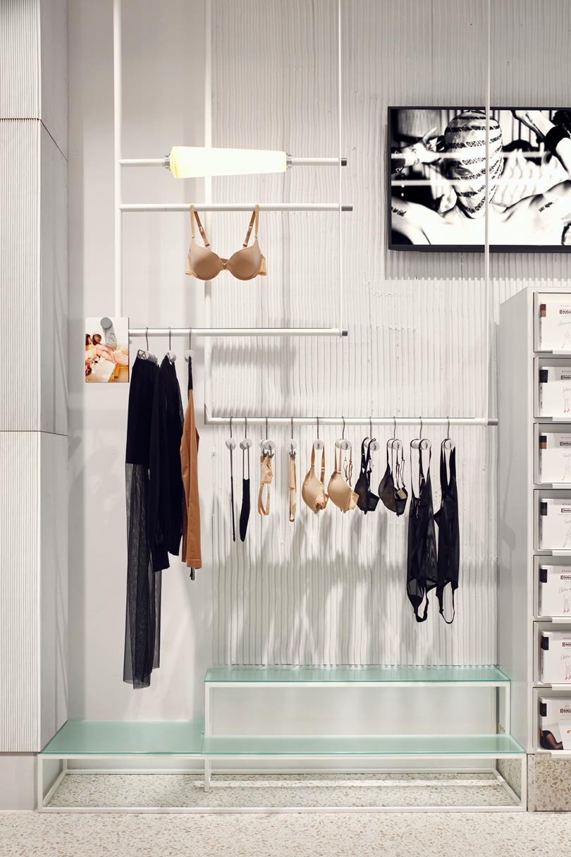 Der Shop enthält viele neue Elemente für Wolford: Außer den verschwundenen Schaufensterpuppen ist es auch das erste Mal, dass die Marke kategorieübergreifend verkauft. "Wir tun dies, um zu zeigen, wie Sie Produkte kombinieren können. Es ist eine neue Art des Einkaufens und vermittelt mehr ein Boutique-Gefühl. So können die Menschen jedes Mal etwas Neues entdecken." Im hinteren Teil des Ladens entschied sich die Designerin, der speziellen Shapewear einen Platz zu geben, der immer noch einen intimen Rahmen erfordert.