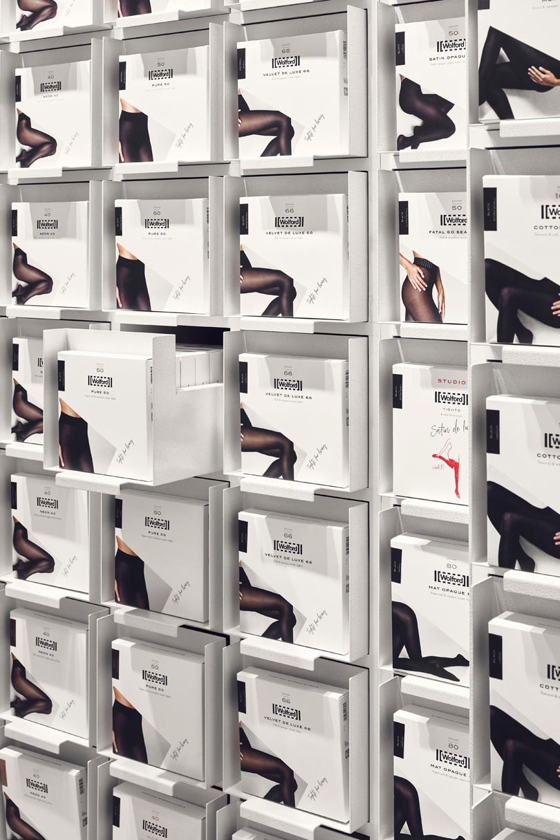 In den “fünfzig Schattierungen des weißen" Ladens ist es auch wichtig, dass sich die verschiedenen Texturen gut abheben, sowohl im Möbelbereich als auch an den Wänden. "Es muss überraschend sein, aber nicht unbedingt ein hochwertiges Material. Die Besucher sollen spüren, dass sie näher kommen wollen, weil sie es berühren möchten. Das gilt auch für Wolford-Produkte. Es ist wichtig, dass die Verbraucher sie auch berühren, denn es handelt sich um Produkte, die auf der Haut getragen werden. "Auch die Schichtstruktur des Ladenkonzeptes passt sehr gut zu Wolford, denn dessen Produkte sind auch eine Art Schicht unter der Kleidung", sagt Stam. Der Shop besteht aus verschiedenen Elementen, die wie Legosteine zusammengesetzt werden können. "Das sorgt für Abwechselung, weil etwas geöffnet oder geschlossen wird oder weil ein anderer "Baustein" darauf platziert wurde. Möbelstücke haben auf der einen Seite ein besonderes Finish, während die andere Seite unverarbeitet ist, genau wie das Bühnenbild einer Aufführung.