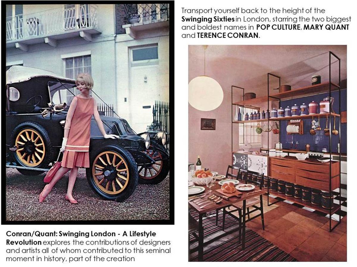 Die Ausstellung „Swinging London: Eine Lifestyle-Revolution“ blickt auf den Zeitraum von 1952 bis 1977 und präsentiert Mode, Textilien, Möbel, Beleuchtung, Haushaltswaren, Keramik und Ephemera in einer Ausstellung, die nicht nur den Stil, sondern auch die sozioökonomische Bedeutung dieser transformativen Zeitspanne untersucht. Zu den wichtigsten Werken gehören seltene und frühe Beispiele von Entwürfen von Conran und Quant sowie die avantgardistischen Künstler, Designer und Intellektuellen, die mit ihnen zusammenarbeiteten.