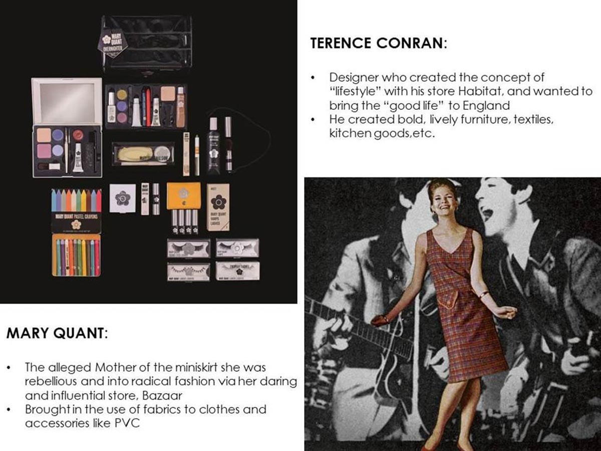 Insbesondere die Mitglieder des Chelsea Sets, einer Gruppe radikaler junger Architekten, Designer, Fotografen und Künstler, rüttelten die starren Nachkriegsjahre auf. Die etablierte Ordnung war der erklärte Feind dieser Gruppe, zu der auch Mary Quant und Terence Conran gehörten.