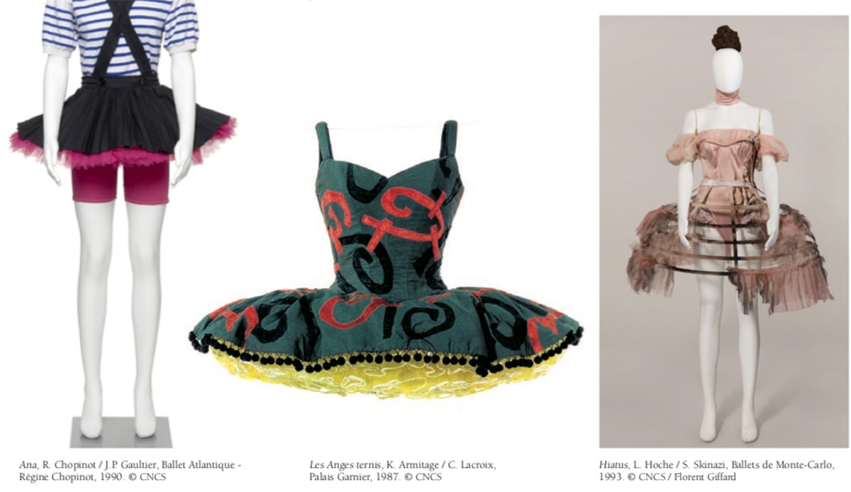 Am Eingang begrüßen die von Hervé Léger für “Rythme de Valse” kreierten Kostüme, die von Roland Petit an der Pariser Oper eingesetzt wurden, den Besucher. Im ersten Stock heben die ersten Schaukästen die Arbeit der Couturiers an den Formen hervor. Dies sind vor allem die Werke von Modedesignern, die vom kreativen Wahnsinn des frühen 20. Jahrhunderts gepackt waren und von denen die Kostüme von Oskar Schlemmers Ballett als Teil des Bauhauses das vielleicht köstlichste Beispiel sind. Auch die Outfits von Jean Paul Gaultier, Viktor & Rolf (The Dutch National Ballet), Gareth Pugh (The Royal Ballet) oder BodyMap, einem Label aus den 80er Jahren, das der berühmte Komplize der Flüge von Michael Clark war, sind ausgestellt.