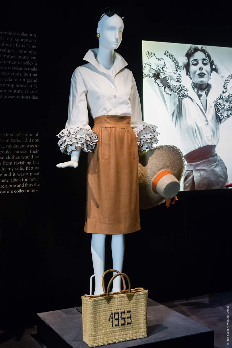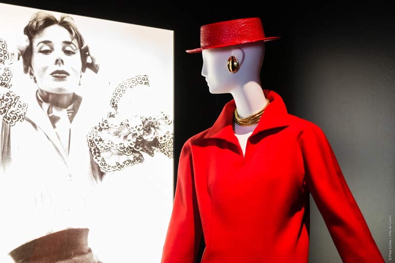 Andere Highlights der Ausstellung beinhalten die ‘Bettina’ Bluse aus seiner ersten Kollektion im Februar 1952 mit Puffärmeln und Lochstickerei, sowie mehrere Ballkleider, ein rotes Satinkleid und Mantel und ein bestickter Hosenanzug.