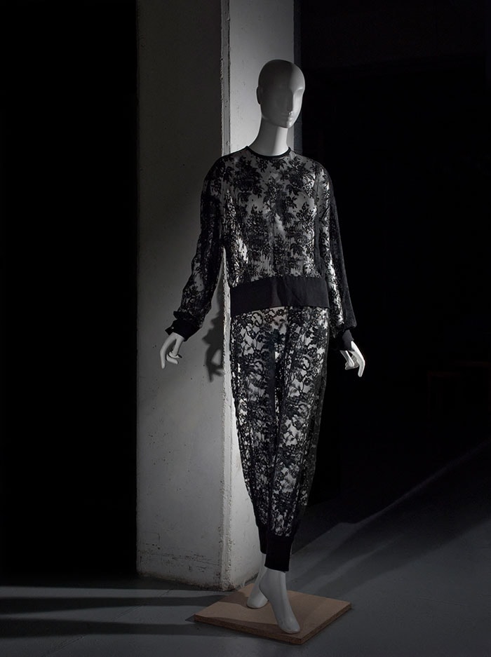 Fotos: Scénography - © Pierre Antoine; Kleid Sonia Rykiel, jogging du soir, 1985; Collection Palais Galliera - © S. Piera / Galliera / Roger-Viollet