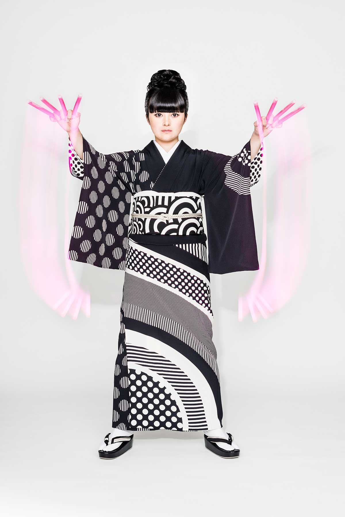 Im Mittelpunkt der Ausstellung steht die jüngste Neuerfindung des Kimonos auf den Straßen Japans, die durch die Arbeit einer aufregenden neuen Welle zeitgenössischer Designer und Stylisten untersucht wird.