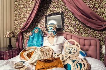 Die Kollektion ‚Kaleidofox’ zum Beispiel besteht aus Stücken, die mit ihren geometrischen Linienverläufen an das Gesicht eines Fuchses erinnern. Darunter verschiedene Taschen, eine Stola, ein Muff und eine Hose – allesamt mit dem charakteristischen kaleidoskopartigen Fuchsgesicht verziert. Ihre Kollektion ‚La Maravilla Enmascerada’ verweist mit ihren Masken auf den Luchador mit dem selben Namen, ein professioneller Wrestler, der stets in Maske auftrat. Die zugehörigen Taschen in Naturleder mit aufwendiger Schnürung, erinnern an Baseballhandschuhe mit zahlreichen Ösen und stellen dem Sport eine sexuell geladene Bondage-Note gegenüber.