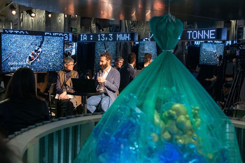 Die Messe eröffnete in diesem Jahr erstmals einen eigenen Nachhaltigkeitsbereich, wobei nachhaltige Marken das Lyceum übernahmen. Ein Bereich namens Reflections im Erdgeschoss beherbergte Ausstellungen, Installationen, Gespräche und Ideen zu Öko-Mode. Eine dieser Ausstellungen war Andrea Caputos 'Land Flag': From Waste to New Materials", ein Einblick in Konsum und Recycling, wobei die Installation die Menge an Kunststoffabfällen visualisierte, die in einer Woche von einem professionellen Studio von etwa sechshundert Quadratmetern, in dem sechzig Personen arbeiten, produziert wird.