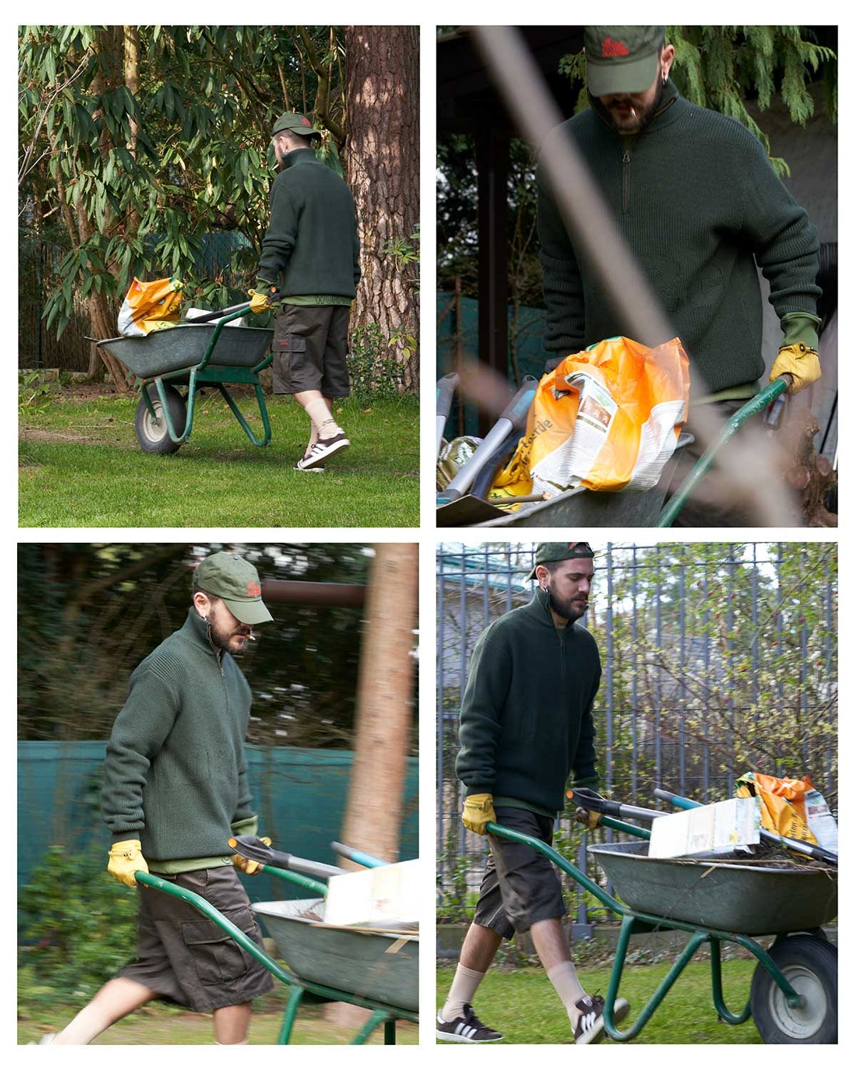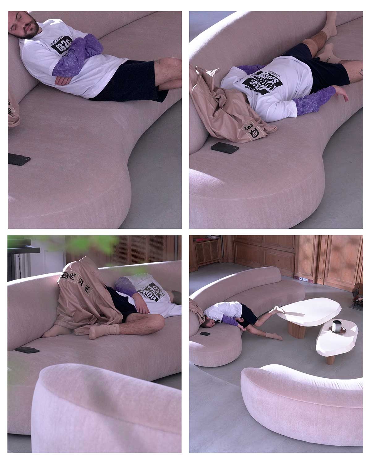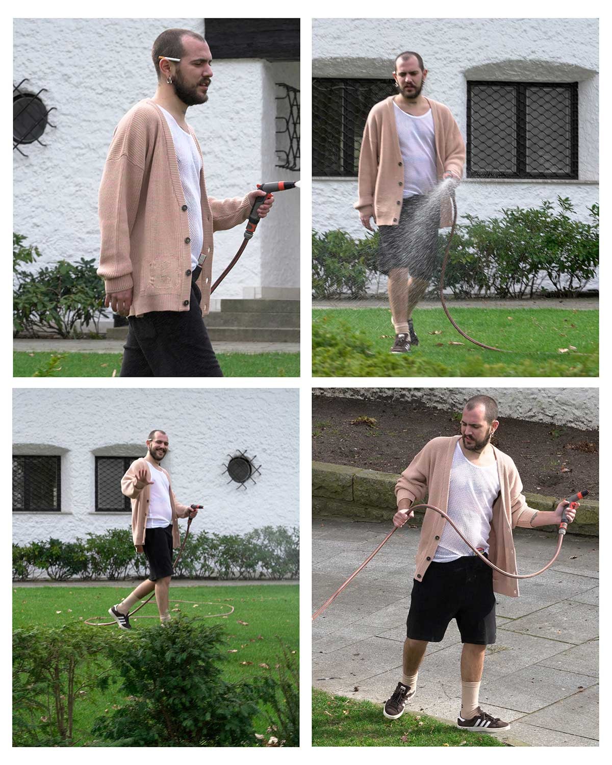 Die Aufnahmen der minimalistischen Kollektionen wirken wie ein Quarantäne-Tagebuch, das Goehring beim Gießen der Blumen, Gassigehen mit dem Hund oder auch bei einem Nickerchen auf der Couch begleitet.