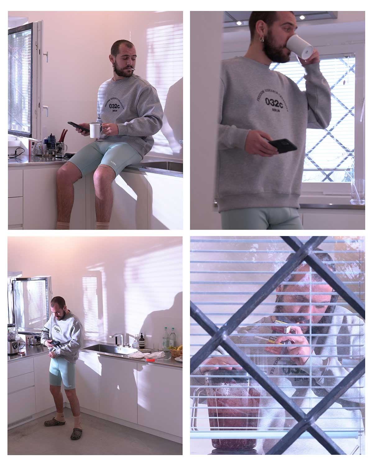 Das Berliner Label und Magazin 032c präsentiert seine neue Kollektion aus der Selbstisolation. Dafür hat sich dessen Fashion Director Marc Goehring von Fotograf Timothy Schaumburg in 13 Szenen ablichten lassen, die ihn in unterschiedlichen Alltagssituationen zeigen.