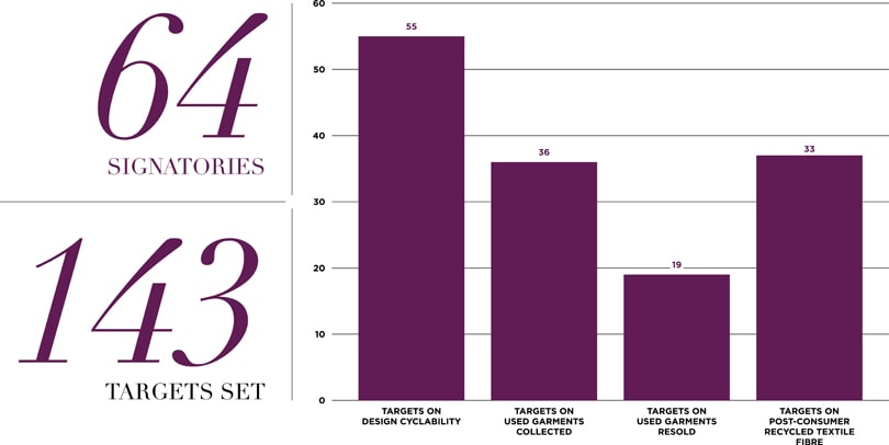 Alle Unterzeichner haben sich Ziele in einem oder mehreren der folgenden vier Bereiche gesetzt: kreislauffähiges Design, Erhöhung des Volumens der eingesammelten, benutzten Kleidungsstücke, Erhöhung des Volumens der verkauften wiedergewonnenen Kleidungsstücke und Erhöhung des Anteils der Kleidungsstücke aus recycelten Post-Consumer-Textilfasern. Innerhalb dieser vier Bereiche hat kreislauffähiges Design mit insgesamt 55 gesetzten Unternehmenszielen das größte Interesse gefunden. Das bedeutet, dass viele Modefirmen entweder ihre Designer in Designsystemen, die auf Kreislaufwirtschaft aufgerichtet sind, schulen oder darauf trainieren, nachhaltige Designprinzipien zu implementieren, wie zum Beispiel die Haltbarkeit eines Produkts zu erhöhen. H&M ist eines der Modeunternehmen, das sich zum Ziel gesetzt hat, Schulungen für das zirkuläre Design zu implementierten.