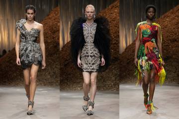 Die Kollektion umfasste auch die für das Label typischen maßgeschneiderten Anzüge in Schwarz und fluoreszierenden Farbtönen sowie Trenchcoats, gerüschte Ballkleider und Lederjacken. Einige Stücke schienen auch von früheren Kollektionen inspiriert zu sein, so erinnerten Anzüge und Kleider mit einem Print an das Kleid, das 1999 bei Lee McQueens Kollektion Nr. 13 von Robotern besprüht wurde.