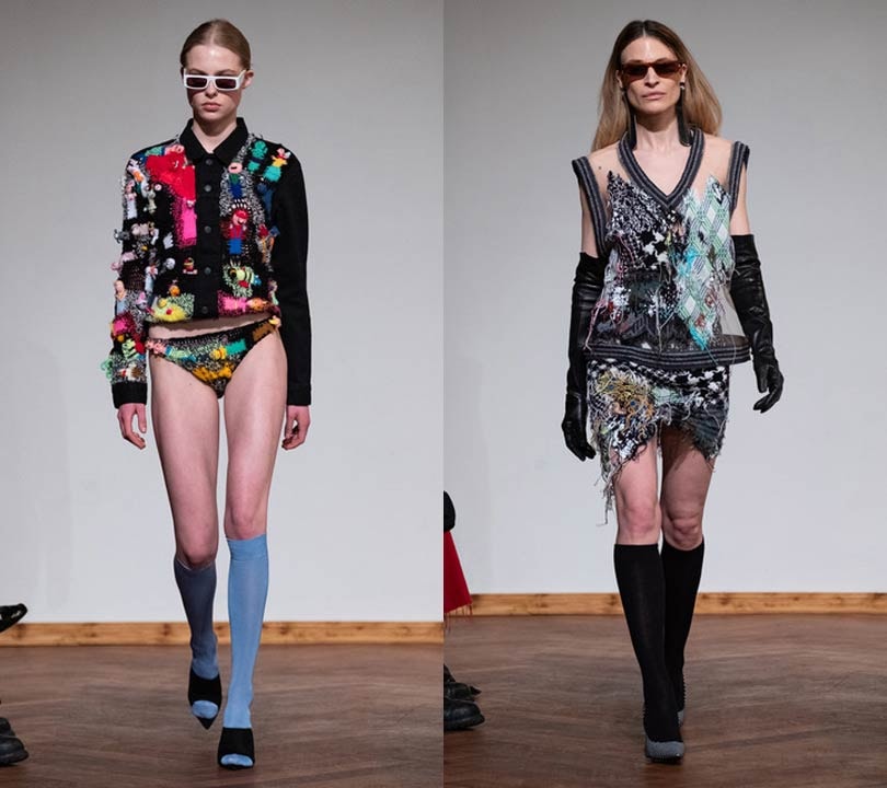 Die erste eigene Laufsteg-Modenschau zeigte Odély Teboul, die früher eine Hälfte des Designerduos Augustin Teboul ausmachte, unter ihrem Anagramm Lou de Bètoly. Die Kollektion mit dem Titel „Eaux-Fortes“ vereinte zum Teil wiederaufbereitete Materialien wie Cashmere, Plastik, Angora und Nylon-Stretch- Elemente und bewies so, dass Luxus und Recycling sehr wohl zusammen gehen. Die patchwork-artigen Arrangements, die in liebevoller Handarbeit hergestellt werden, nennt die Designerin „Ethno Dada“.