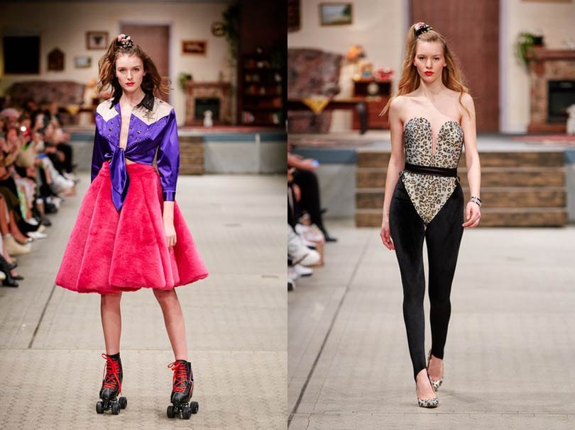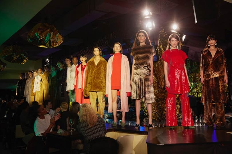 Eine starke Kollektion zeigte William Fan. In seiner typischen Handschrift gab es bei der Kollektion mit dem Titel „It’s Your Time To Shine“, die passenderweise in der Karaokebar „Knutschfleck“ gezeigt wurde, jede Menge Glanzstücke zu sehen. Die Models stiegen in Paillettenoutfits erst auf die Bühne der Bar, anschließend führte der Laufsteg über deren Tresen. Die Inspiration entspringt tatsächlich einer Karaokebar, allerdings in Hong Kong. Die bunte Mischung derer, die das abendliche Ritual anzieht, darunter auch ernste Anzugträger und heimliche Showtalente, bringt Fan mit Hilfe von Animal Prints, Cocktailkleidern und Cordstoffen zum Ausdruck.
