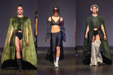 Die Show startete mit einer Videoprojektion, unterlegt mit kraftvoller, epischer Musik. Das erste Model betritt den Laufsteg in schwarzer Unterwäsche, eingehüllt in einen bodenlangen, schwarzen Kunstfell-Mantel mit Schleppe. Dazu kombiniert werden eine riesige Skibrille und auffallende weiße Kopfhörer.